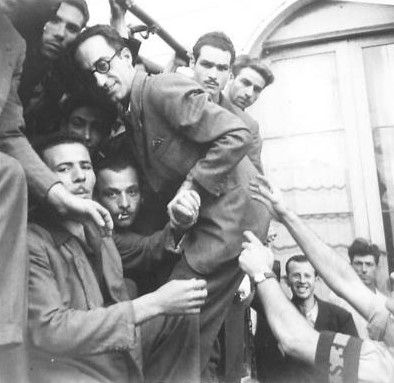 (NA 6018): One of Sicily’s former Fascist leaders, Advocate Santagarti, Vice-Secretarii Federale of Catania, has finally been caught, having fled from Catania before the Allied advance. He was arrested in the town of Trecastagni, and here is seen boarding a truck crowded with other Fascists on their way to the internment camp.