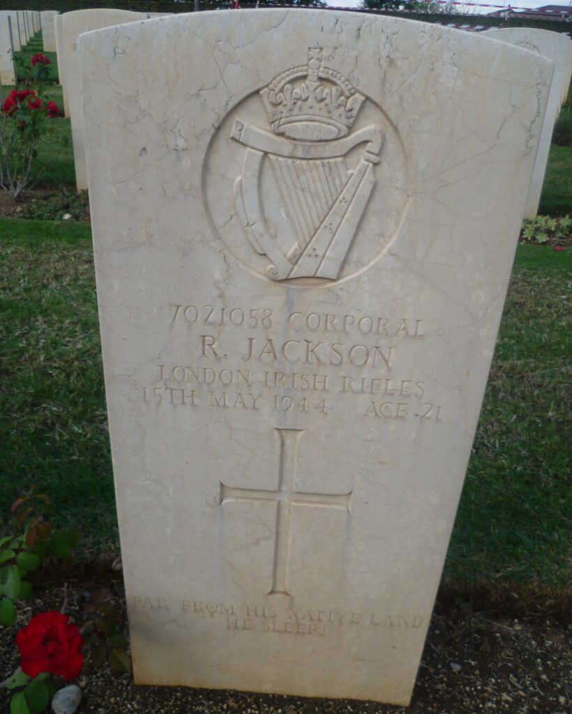 Robert Jackson was killed during an O Group being held by Lt Col Ion Goff and which was the target of German artillery on the afternoon of 15 May 1944, as the 2nd Bn. London Irish Rifles prepared for the attack on the German Gustav Line defences at Sinagoga.