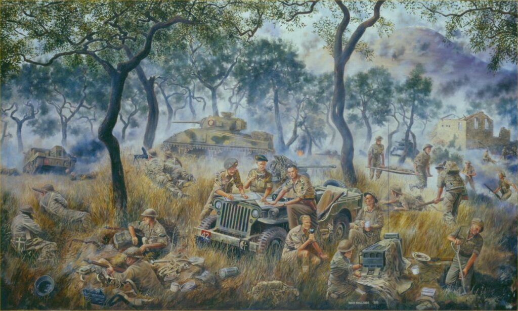 “Ion Goff was down, mortally wounded, and a few minutes later the CO of the 16th/5th, Colonel John Loveday, followed him. By the time I reached the Tac HQ shortly afterwards, the battalion had already suffered heavy casualties in the fire storm, including Geoffrey Phillips, Ken Lovatt the signals officer and most of the signallers, who were with him.”