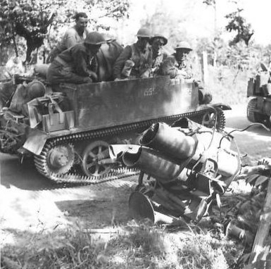 (NA 15654): Mortar carriers of 1st Royal Irish Fusiliers pass a wrecked Nebelwerfer.