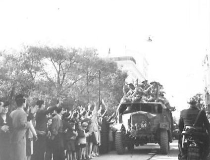 (NA 2560) : Allied troops receive a terrific reception as they pass through Tunis. IWM.
