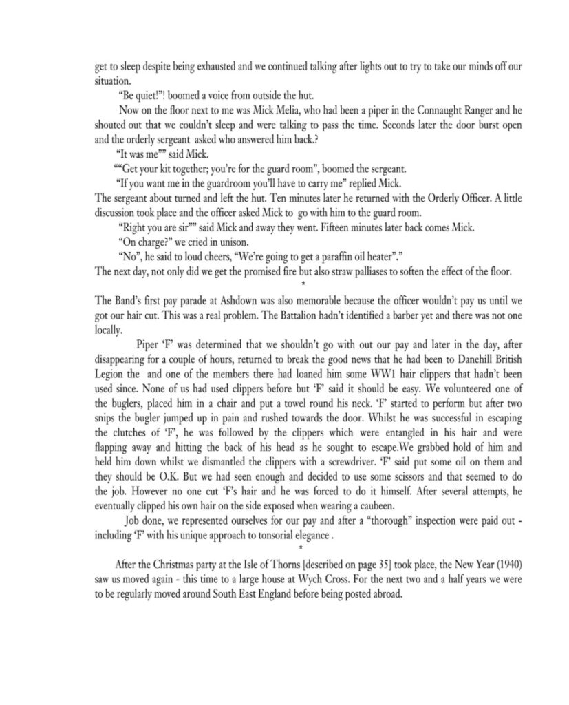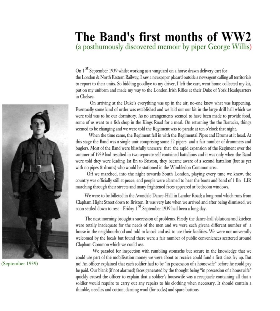 George Willis had grown up in a large family in the East End of London and learnt to play the pipes at a very early age and, by the time he joined the LIR, he had been a member of four different pipe bands. His direct connections with the LIR and their Pipes and Drums would span a total of more that 60 years after which he continued to support Regimental Association activities (now, in a literary manner) right up to the time of his death in 2011.