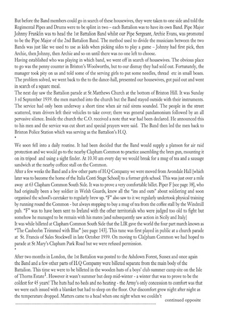 He and his son, George, co-authored a fantastic account of the history of the Pipes and Drums of the London Irish Rifles in 2006 and this continues to be updated and the latest version is now accessible in a downloadable form here (a large pdf file).