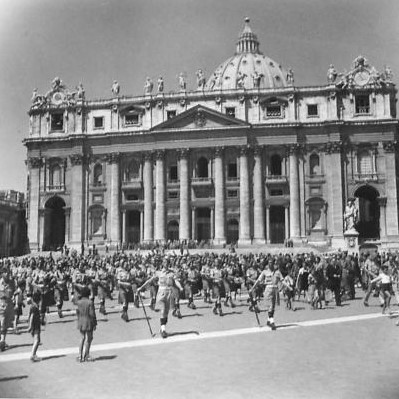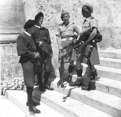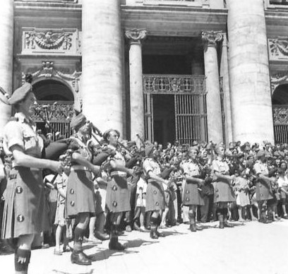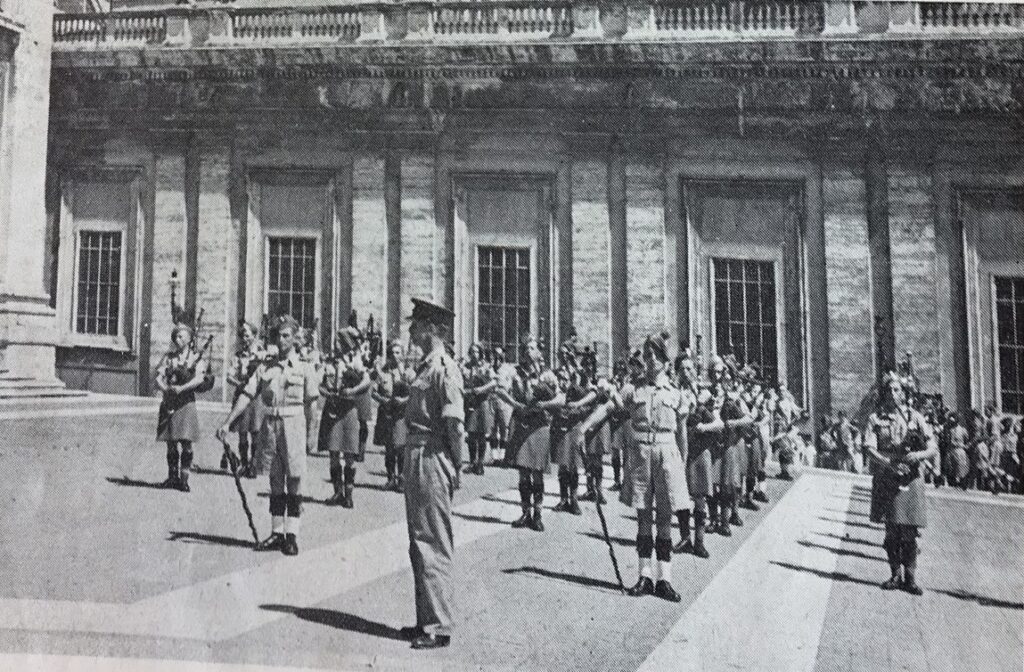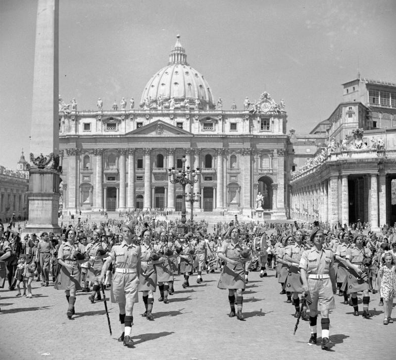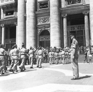 (NA 16179) The band of the Irish Brigade plays at the Vatican City. IWM.(NA 16174): Brigadier Scott takes the salute.(NA 16175).(NA 16176): The massed pipe band of the Irish Brigade.(NA 16177): The pipe band marches away from the Church. (NA 16178): The pipe band marches away from the square. (NA 16180): L/Cpl. A. Prout (right) of Balham,, Sgt. R. Kane of Hillsborough, Co. Down.