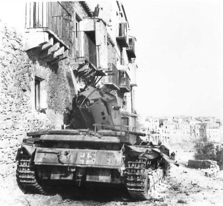 (NA 5389) A German Mk III tank knocked out during the fierce street fighting in Centuripe.